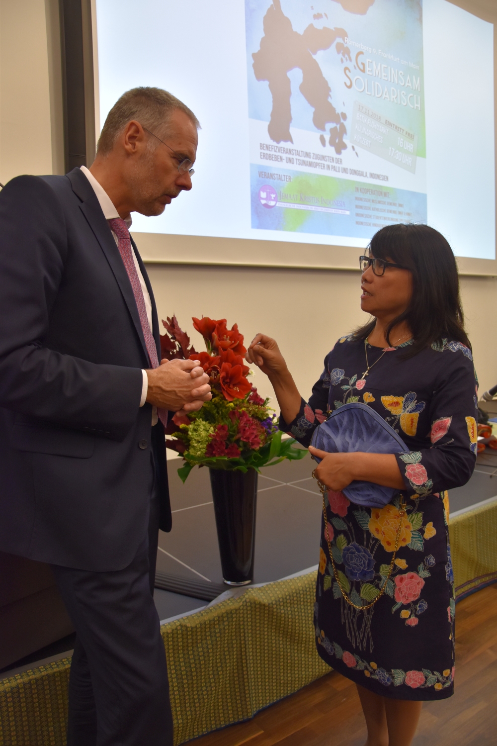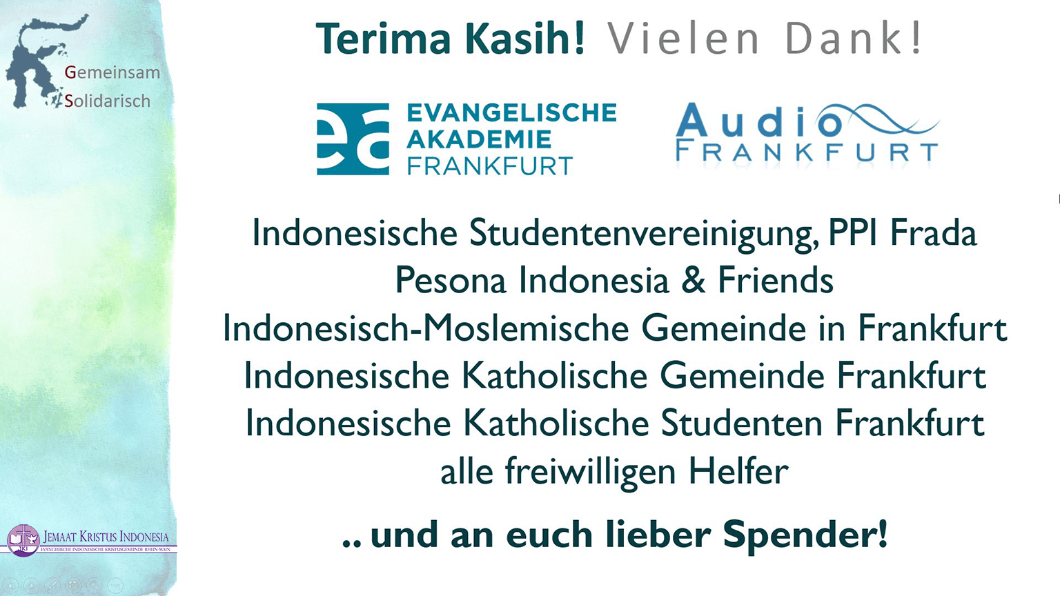 Unsere Spenden fließen auf direkten Weg in die Donggala Kirche, um auch eine schnelle Hilfe für die Gemeinden, unabhängig welcher Religion, zu gewährleisten. Denn wer kennt die hilfsbedürftigen Positionen nicht besser, als die Menschen vor Ort selbst. Mit den Einnahmen zu unserer Benefizveranstaltung möchten wir u. a. für die Humanitäre Hilfe und den Wiederaufbau eines interreligiösen Bildungszentrums unterstützen. Weiter möchten wir mit dieser Veranstaltung auch ein Zeichen setzen, dass wir im Dialog und der notwendigen gegenseitigen Hilfe, auch die schwersten Zeiten überwinden können. Gemeinsam und solidarisch müssen wir den betroffenen Menschen weiterhin eine hoffnungsvolle Zukunft aufzeigen.